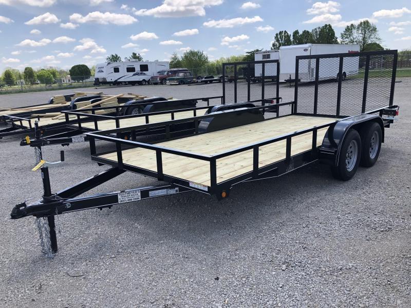 The 77x16 Lone Wolf Tandem Axle Utility Trailer has treated wood floor, 1 brake axle, rear fold down gate and Silver Mod Wheels. The trailer as 7,000 GVW and is black in color.