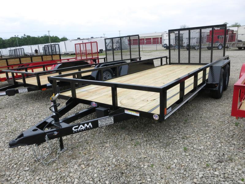 The 7X16 Cam Superline Tandem Axle Wood Floor Utility Trailer has treated wood floor, 15" tires, powder coat paint, tube top rail and up rights, rub rail, set back jack, brakes on both axles, radial tires, diamond plate fenders, LED lights, and rear fold in gate. The trailer as 7000 GVW and is black in color.