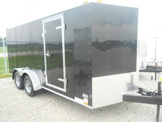 The Continental Cargo 7X16 Tandem axle enclosed trailer is black in color with ramp door, 6" extra height, 32" Side door, (1) 12V Dome Light, LED Tail Lights, and 24" Aluminum Tread Plate Stoneguard (ATP) and 1 set of stabilizer jacks. The GVW is 7,000 lbs.