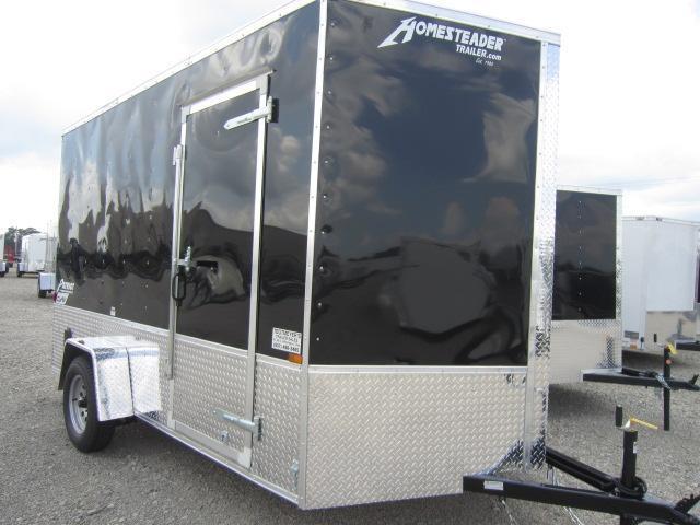 Homesteader 7x12 SA Enclosed Trailer is black in color with Rear ramp door, stoneguard and 32" side door, OHV Package with diamond plate, and 12"extra height. The trailer is a Patriot model and is 2,9900 gvw.