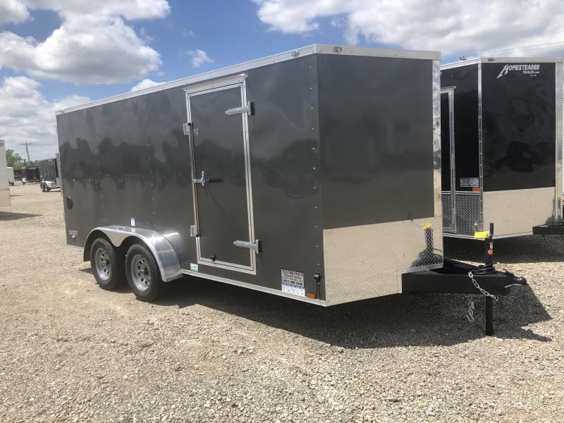 The Continental Cargo 7X16 Tandem axle enclosed trailer is charcoal in color with ramp door, 32" Side door, (1) 12V Dome Light, LED Tail Lights, and 24" Aluminum Tread Plate Stoneguard (ATP) and 1 set of stabilizer jacks. The GVW is 7,000 lbs.