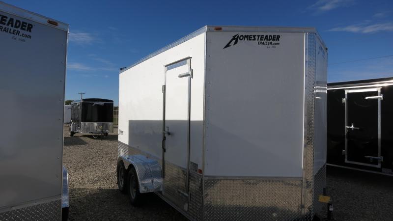 Homesteader 7x14 TA Enclosed Trailer is white in color with ramp door, v nose, 12 inches extra height, 16" on center walls, side wall vents, 4 d rings and side door. The trailer is a Intrepid (formerly Patriot) model and is 7,000 gvw.