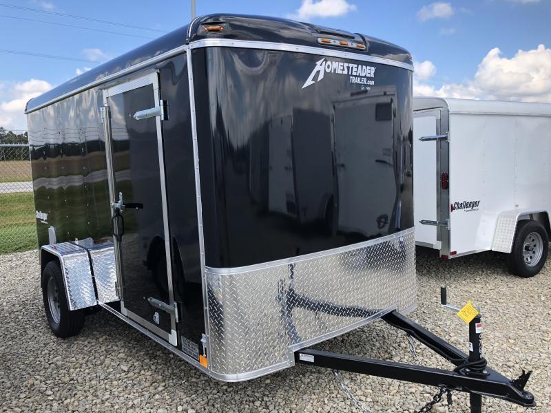 The Homesteader 6x12 Single Axle is a Challenger Model. The trailer has a 32" side door, stone guard, and rear ramp door. The trailer is black in color with 2,990 GVW.