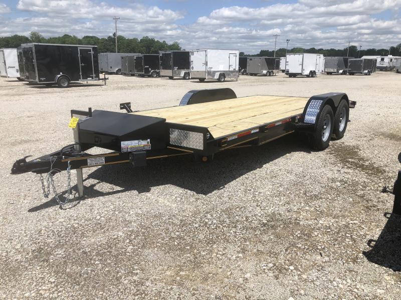 The 82x18 Heartland Tandem Axle Car Hauler has treated wood floor, 1 brake axle, Ramps out the rear, powder coat paint, Tongue Tool Box, and Silver Mod Wheels. The trailer as 7,000 GVW and is black in color.