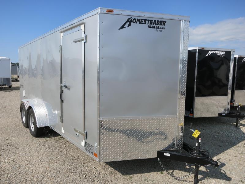 The Homesteader 7x16 Enclosed Trailer is silver in color. The trailer has 7000 gvw, rear ramp door, 4 drings in the floor, stoneguard, side door and side wall vents.