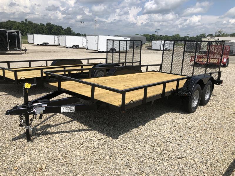 The 7x16 Tandem Axle Utility Trailer has treated wood floor, rear fold down gate and Silver Mod Wheels. The trailer as 7,000 GVW and is black in color.