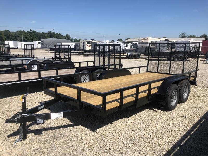 The 7X16 Tandem Axle Wood Floor Utility Trailer has treated wood floor, 15" radial tires, and rear gate. The trailer as 7,000 GVW and is black in color.