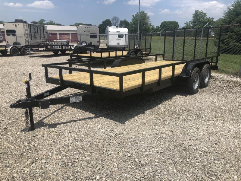 The 7X16 Tandem Axle Wood Floor Utility Trailer has treated wood floor, 15" radial tires, and rear gate. The trailer as 7,000 GVW and is black in color.