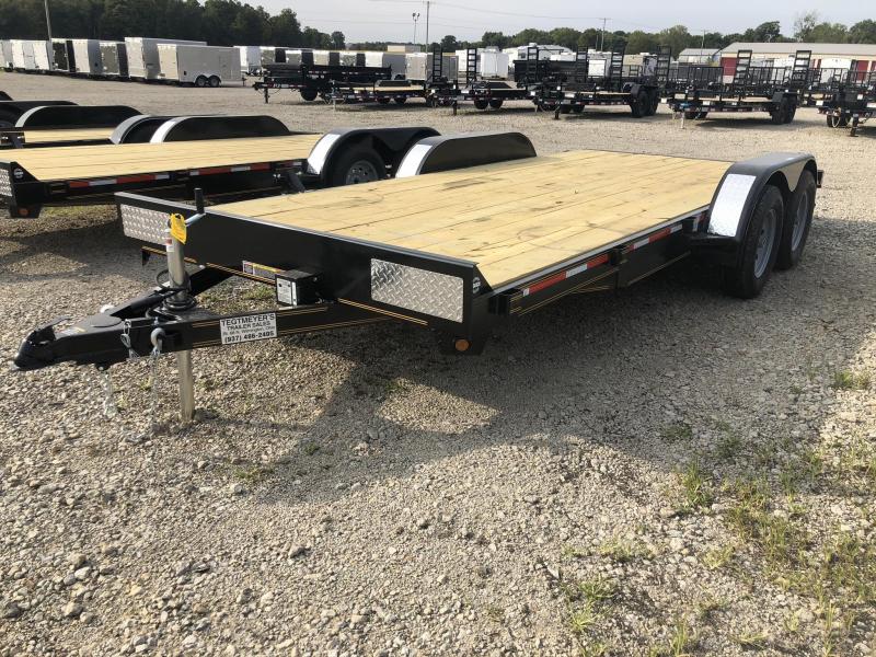 The 82x18 Tandem Axle Car Hauler has treated wood floor, 1 brake axle, Ramps out the rear, powder coat paint, and Silver Mod Wheels. The trailer as 7,000 GVW and is black in color.