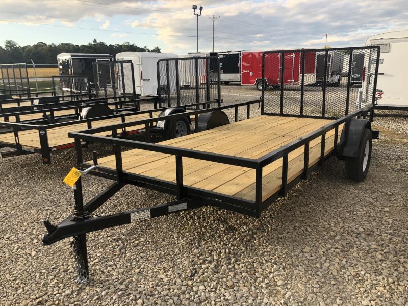 The 6X14 Single Axle Wood Floor Utility Trailer has treated wood floor, 15" radial tires, and rear gate. The trailer as 2,990 GVW and is black in color.