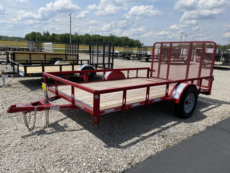 The 82x12 Single Axle Utility Trailer has treated wood floor, dove tail w/ 4' rear fold down gate, Side loading ramps, powder coat paint, and Silver Mod Wheels. The trailer as 2990 GVW and is black in color.