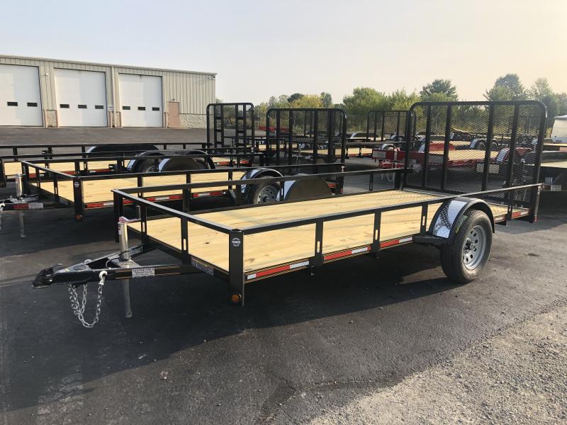 The 82x14 Single Axle Utility Trailer has treated wood floor, dove tail w/ 4' rear gate, powder coat paint, and Silver Mod Wheels. The trailer as 2990 GVW and is black in color.