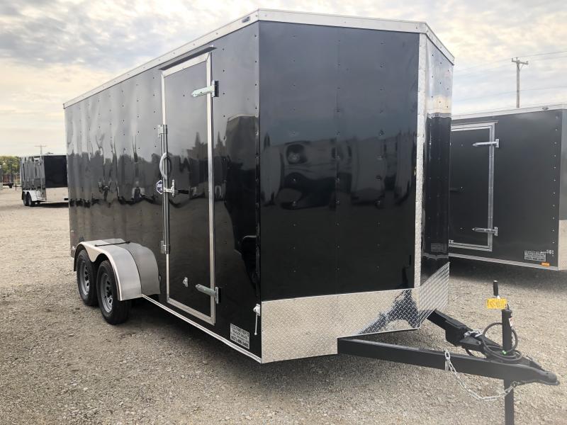 The American Hauler 7X14 tandem axle enclosed trailer is black in color with rear ramp door, 6'6" interior height, 12 Volt Dome Light with (1) Wall Switch at side door, LED Tail Lights, and Aluminum Tread Plate Stoneguard (ATP).