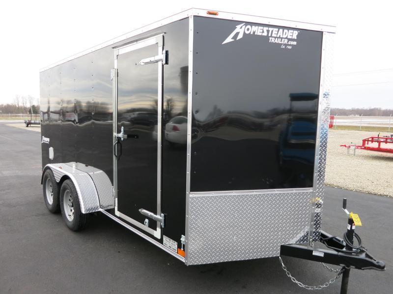 The Homesteader Intrepid 7x16 Enclosed Trailer is black in color. The trailer has 7000 gvw, rear ramp door, stoneguard, side wall vents and side door. The trailer is a Intrepid (formerly Patriot) model.