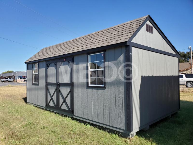 30YR. ARCHITECTURAL SHINGLE ROOF, GARDEN SHED ROOF, 7/16" OSB ROOF DECKING, 50YR. LP SMARTSIDE EXTERIOR SIDING & TRIM, PAINTED EXTERIOR, 6'4" SIDE WALL HEIGHT, PREMIUM 2"X4" STUD WALLS 16" ON CENTER, DOUBLE STUDDED EVERY 4', DOUBLE HEADER PLATE (2"X4" PLUS 2"X8" TOP PLATE), (4) 4"X6" PRESSURE TREATED SKIDS, PREMIUM 2"X6" FLOOR JOISTS 16" ON CENTER, PREMIUM 5/8" PLYWOOD FLOOR DECKING, 6'X6' DOUBLE BARN DOORS, (2) 2'X3' SINGLE PANE WINDOWS, (1) 12' WORK BENCH, (2) 12' SHELVES, 4'X8' PEGBOARD, RADIANT BARRIER.