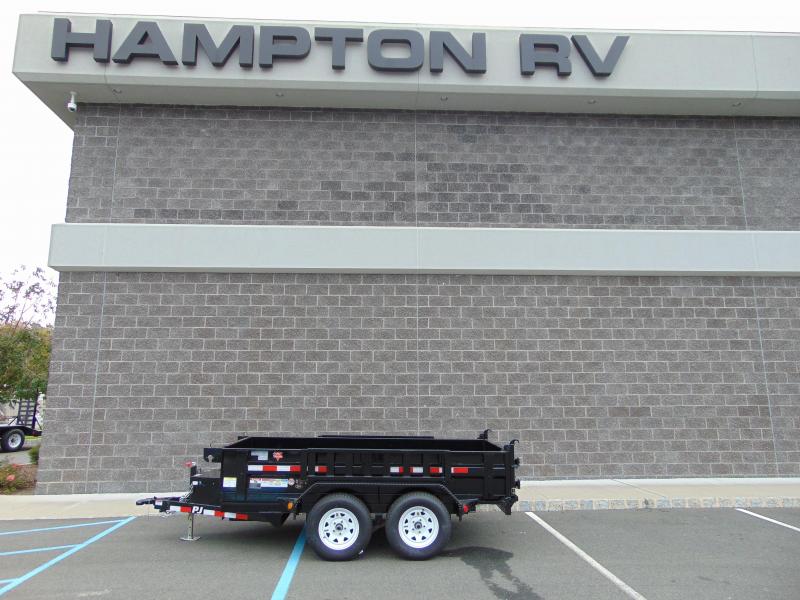 2022 PJ Model# D5102 5 x 10 Dump Trailer, side ramps, 2- 5200 lb Dexter EZ-Lube tandem axles with brakes on both axles, 2" A-Frame coupler, drop leg jack, 4 leaf double eye spring suspension. ST225/75-R15 inch radial tires on 5 lug wheels, electric break-a-way with charger, 1/8 inch treadplate fenders, barn door gate, 40 degree pitch, 3" x 30" hyd cyl, 12' control cable, 4" channel main frame & tongue, 2" x 4" 11 gauge tubing bed frame, 3" channel crossmembers, 16" on center, 10 gauge steel bed and sides, 18" high sides , LED lights, sealed wire harness, sand blasted, acid washed, primed, powder coated, interstate battery with charger. GVWR: 9899 lbs., Shipping Weight: 2530 lbs. Capacity Load: 7369 lbs. " includes shipping - TARP KIT NOT INCLUDED (NOTE: PICTURE SHOWS 5 LUG WHEELS, THIS ONE IS 6 LUG), 5200 LB AXLES AND 225/75R 15 TIRES