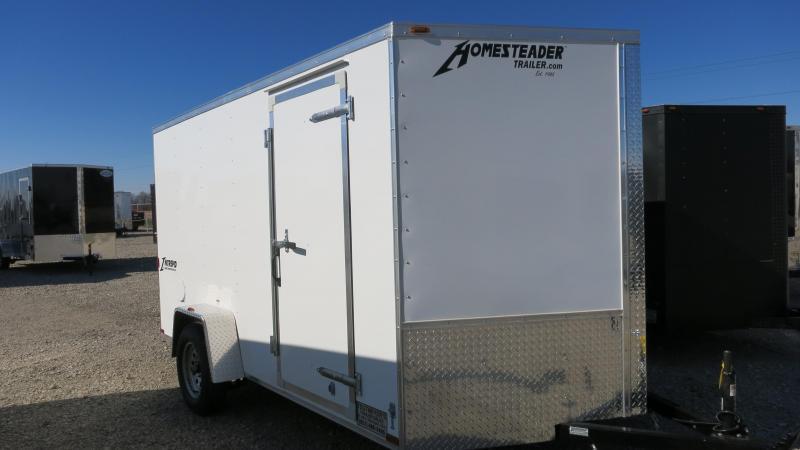 Homesteader 7x12 SA Enclosed Trailer is white in color with Rear ramp door, stoneguard and 32" side door. The trailer is a Intrepid (formerly Patriot) model and is 2,9900 gvw.