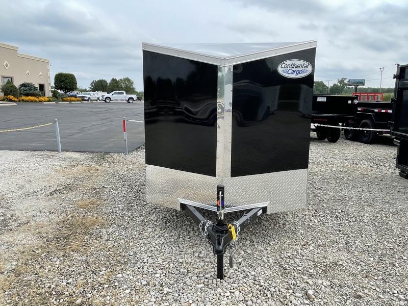 The Continental Cargo 5X10 single axle enclosed trailer is black in color with rear double doors, (2) 12 Volt Dome Light with (1) Wall Switch at side door, LED Tail Lights, stablizer jacks at rear, side vents, slant wedge, 5.5 wide upgrade, aluminum roof, and 24" Aluminum Tread Plate Stoneguard (ATP).