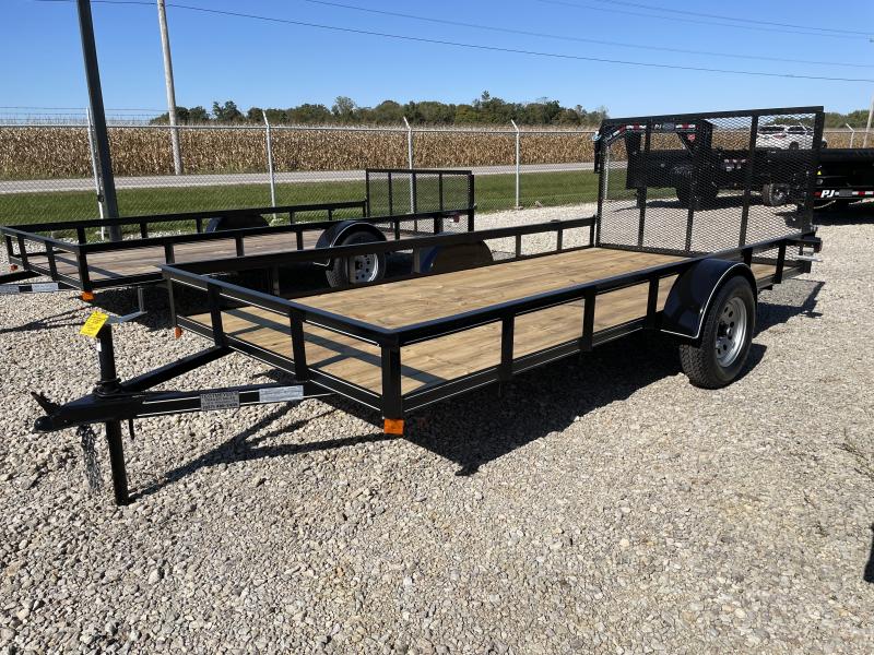 The 6x14 P&T Single Axle Utility Trailer has treated wood floor, rear fold down gate, and Silver Mod Wheels. The trailer as 2,990 GVW and is black in color.