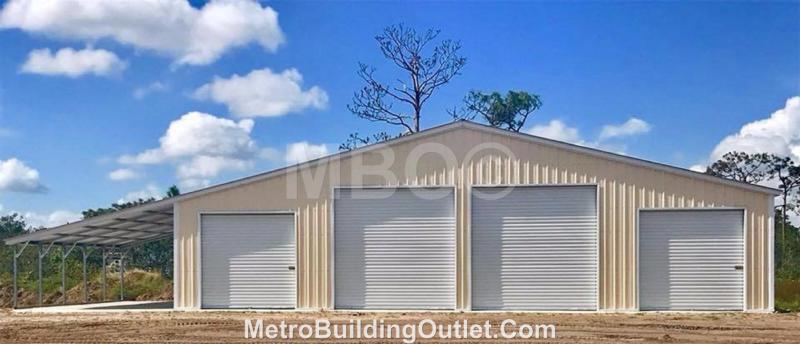 60X30 BARN / GARAGE #B122, VERTICAL ROOF, 24X30X12 CENTER BAY GARAGE, (2)12X30X9 ENCLOSED LEAN-TO'S, (1)12X30X6 OPEN LEAN-TO, (2)10X10 GARAGE DOORS, (2)10X8 GARAGE DOORS, (1)36X80 WALK IN DOOR.