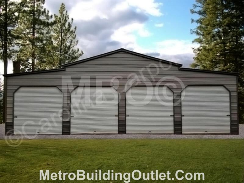 48X30 BARN / GARAGE #B163, VERTICAL ROOF, 24X30X14 RAISED CENTER BAY GARAGE, (2)12X30X11 LEAN-TO'S, (4)10X10 GARAGE DOORS, (1)36X80 WALK IN DOOR.