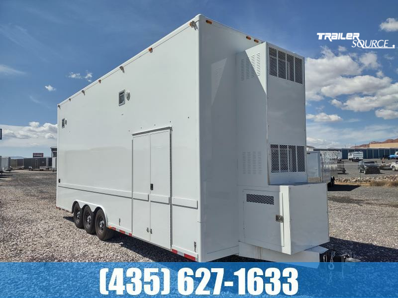 LOADED Silver 26' Silver Crown Stacker Trailer ... with a new MSRP over $150,000, this trailer is sure to turn heads and is ready to be put to work with your toys or at the track... features include 17' stacker hoist system, 6500 watt Honda generator, dual air conditioners, overhead sleeper area, built in air compressor, triple 7k torsion axles, 14 ply tires, warn winch system, upgraded stereo system, power lift rear ramp door, ramp extension, double side door, rubber coin floor, numerous tool box and shelves, hydraulic front landing gear, e-track throughout the cargo area, and more!