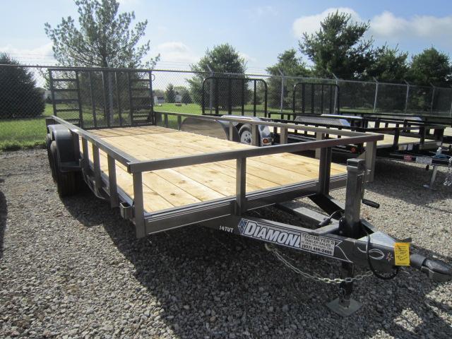 Diamond C 18' Tandem Axle Utility Trailer is gray in color. The utility has a rear heavy duty gate tractor gate, spring assist gate, black wheels, and pipe top rail. The trailer has 2 - 5,200 lbs axles with brakes and is extra wide. This is 14TUT model.
