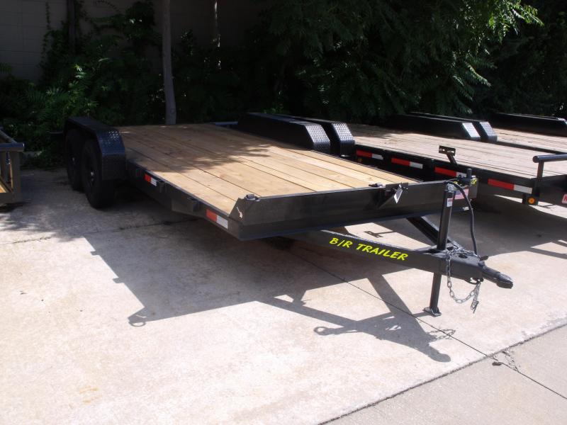 Here you are looking at a New B/R Car Hauler a 82" X 18 or a 82" X 16' + 2' Dove Tail 2 - 3500 # Axles with Wasy-Lube-Spindles 2" Cast coupler Electric brakes one axle Wrapped tongue 2000 LB Jack / Setback to not hit your tailgate whe lowering Treated wood deck D-rings installed 7 Way electrical plug LED Lights DOT Tape Diamond fenders Black trailer wheels (MOD) New radial trailer tires ST205/75R/15 Tires Stake pocket / Tiedowns Spare tire mound forward center Safety chains