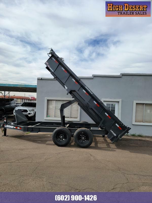 Lamar's 14,000 lb. dump trailers are the baddest on the market. They feature Heavy Duty I-Beam frames with re-enforced gussets, Thickest on the market "7 Gauge Floor"- thicker than competitions 10 gauge. Tarps, Ramps, 3-way gate, LED lights, Sealed wiring harness, sand blasted prep- powder coated finish, Gas shock on tool box lid, Ultra Heavy-Duty Rigid Rails, and a 3-year frame warranty, 6-year axle warranty, 1-year tire, and Life Time LED light warranty.