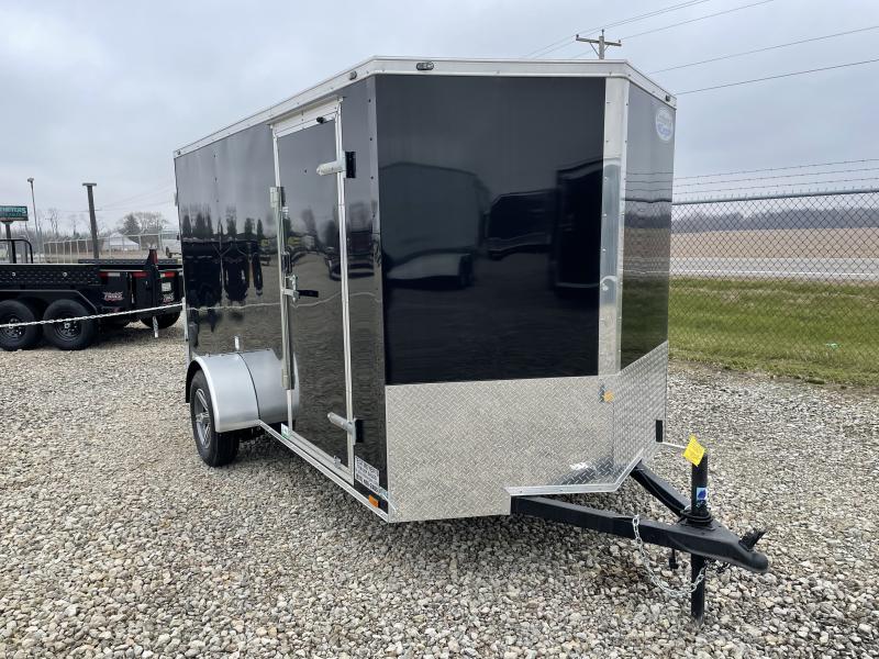 The Continental Cargo 6X12 single axle enclosed trailer is black in color with double rear door, Aluminum Wheels, (2) 12 Volt Dome Light with (1) Wall Switch at side door, LED Tail Lights, stablizer jacks at rear, and 24" Aluminum Tread Plate Stoneguard (ATP).