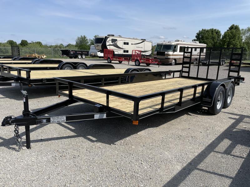 The 82x20 P&T Tandem Axle Utility Trailer has treated wood floor, 1 brake axle, rear fold down gate and Silver Mod Wheels. The trailer as 7,000 GVW and is black in color.