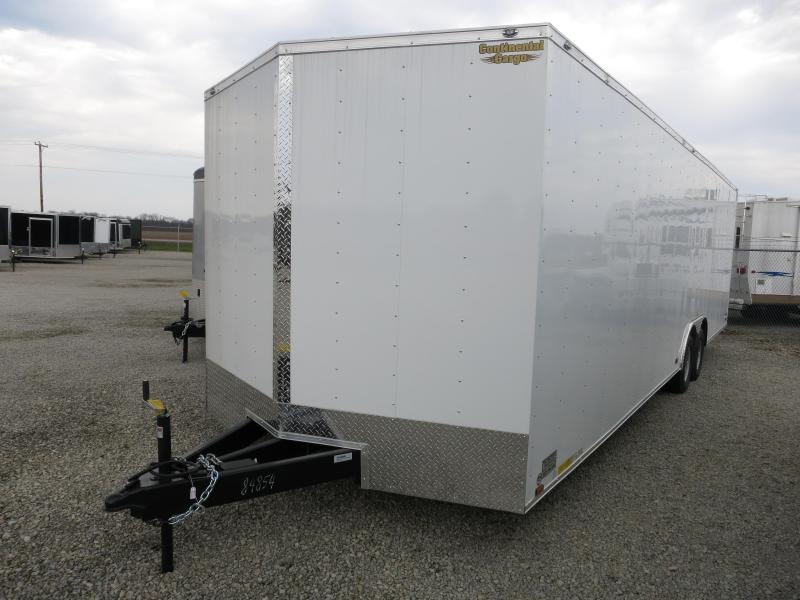 The Continental Cargo 8.5x28 Tandem axle enclosed trailer is WHITE in color with rear ramp door, Side door, (1) 12V Dome Light (Total of 2) with (1) Wall Switch, LED Tail Lights, roof vent, 6" extra height, extended tongue, flush lock side door, radial tires, 4 drings and 24" Aluminum Tread Plate Stoneguard (ATP). The GVW is 10,000 lbs.