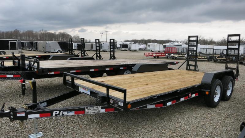 The 18' PJ Tandem Axle Flatbed Trailer has treated wood floor, 2' dovetail, brake, 5" channel construction, adjustable coupler, extra wide, stand up ramps and powder coat paint. The trailer as 10,000 GVW and is black in color.