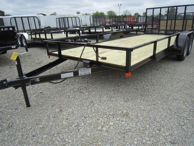 The 82x18 P&T Tandem Axle Utility Trailer has treated wood floor, 1 brake axle, rear fold down gate and Silver Mod Wheels. The trailer as 7,000 GVW and is black in color.