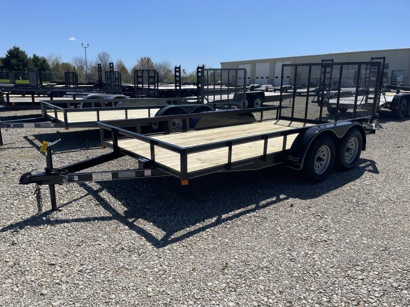 The 82x14 Tandem Axle Utility Trailer has treated wood floor, 1 brake axle, rear fold down gate, silver Mod Wheels. The trailer as 7,000 GVW and is black in color.