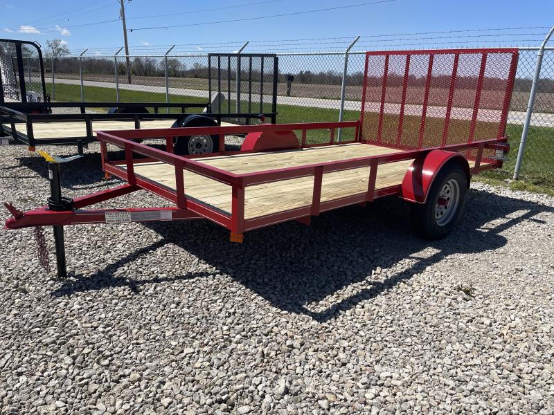 The 6x12 Single Axle Utility Trailer has treated wood floor, rear fold down gate, and silver Mod Wheels. The trailer as 2,990 GVW and is red in color.