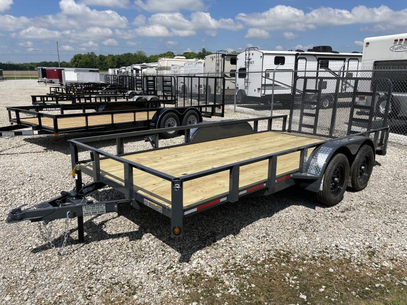 The 82x16 Heartland Tandem Axle Utility Trailer has treated wood floor, 1 brake axle, rear fold down gate w/ramps built in, dove tail, powder coat paint, and Black Mod Wheels. The trailer as 7,000 GVW and is gray in color.