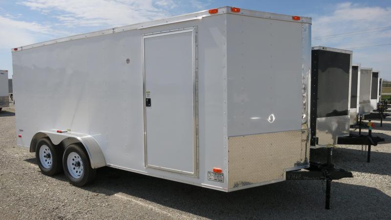 The Freedom Trailer is 7x16 Tandem Axle trailer has a 32" RV door with flush look, dome light, with switch at side door, Electric brakes, Interior height 6', roof vent, radial tires, dexter axles, LED lights, Color matched screws, 16 on center cross members, 3/4 plywood floor, 3/8 plywood wall, stone guard, and rear ramp door. The trailer is white in color with 7,000 GVW.