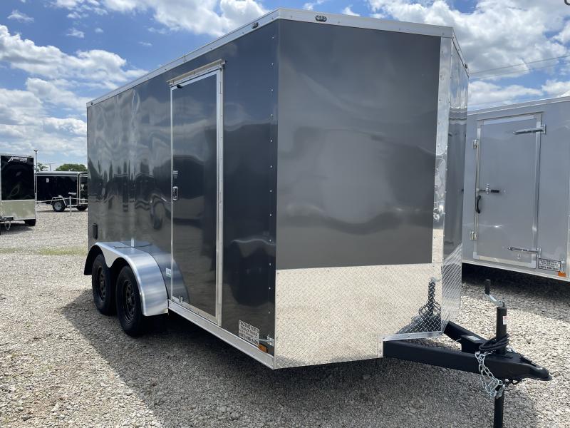 The Continental Cargo 7x14 Tandem axle VHW enclosed trailer is Charcoal Gray in color with rear ramp door, (2) 12 Volt Dome Light with (1) Wall Switch at side door, RV style Side Door, LED Tail Lights, stablizer jacks at rear, 6" extra height, LED Loading Light, 9 Drings, 4" bottom trim, 7,000 lbs gvw, and 24" Aluminum Tread Plate Stoneguard (ATP).