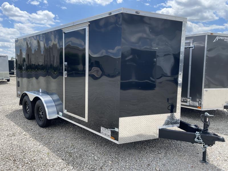 The Continental Cargo 7X16 Tandem axle enclosed trailer is Black in color with rear ramp door, (2) 12 Volt Dome Light with (1) Wall Switch at side door, RV style Side Door, LED Tail Lights, stablizer jacks at rear, 7,000 lbs gvw, and 24" Aluminum Tread Plate Stoneguard (ATP).