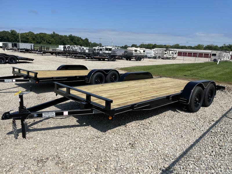 The 82x18 Tandem Axle Wood Floor Car Hauler has 1 brake axle, ramps at the rear, dove tail, driver side removable fender, 4" Channel Mainframe and tongue, and Black Mod Wheels. The trailer as 7,000 GVW and is black in color.
