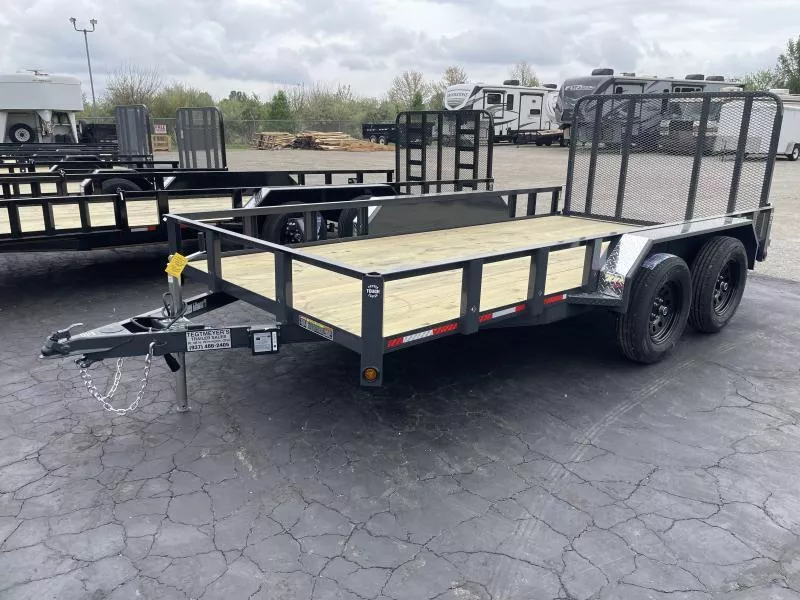 The 82x14 Heartland Tandem Axle Utility Trailer has treated wood floor, 1 brake axle, rear fold down gate, powder coat paint, and Black Mod Wheels. The trailer as 7,000 GVW and is gray in color.