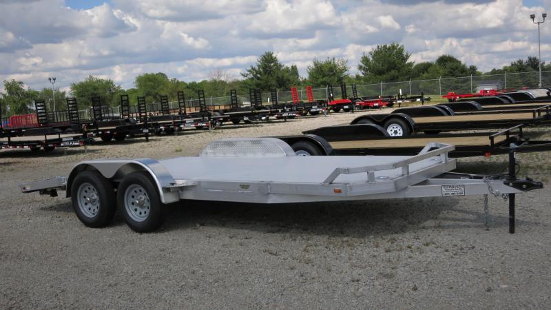 The Continental Cargo 7X18 Tandem axle All Aluminum Open Car trailer has 3' Beavertail, Fold-Down Stabilizer Jacks, (4) 5,000 lb. D-Rings, Tandem Removable Fenders, Removable Rear Ramps, Chrome Lug Nuts, Chrome Center Caps, and aluminum plank floor. The GVW is 7,000 lbs.