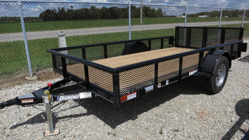 Diamond C 6x12 Single Axle Utility Trailer is black in color. The single axle utility has pipe top rail, treated wood floor, expanded metal sides, radial tires, and a rear spring loaded gate. Top of the line trailer.