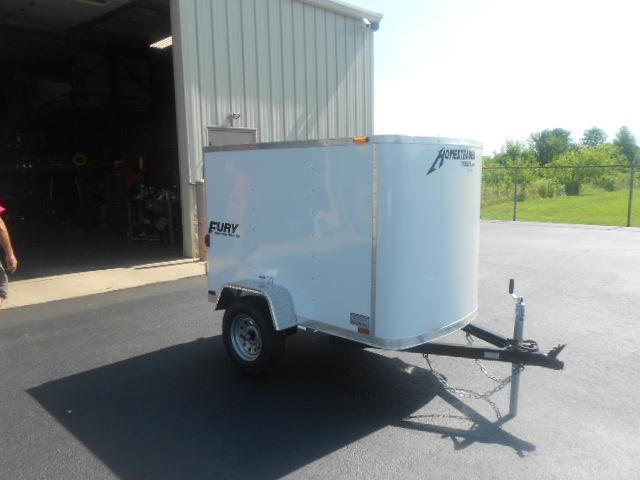 Homesteader 4x6 Single Axle Enclosed is white in color. The trailer has a single rear door and 2990 GVW.