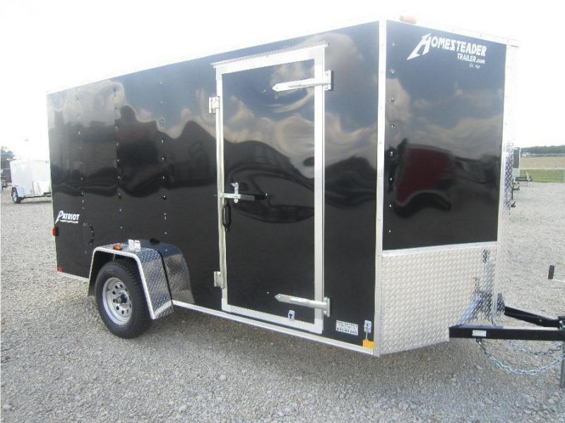 The Homesteader 6x12 Single Axle Enclosed Trailer is black in color. The gvw is 2,990 lbs. The trailer has a 32" side door, side wall vents, drings, stoneguard, and ramp door.