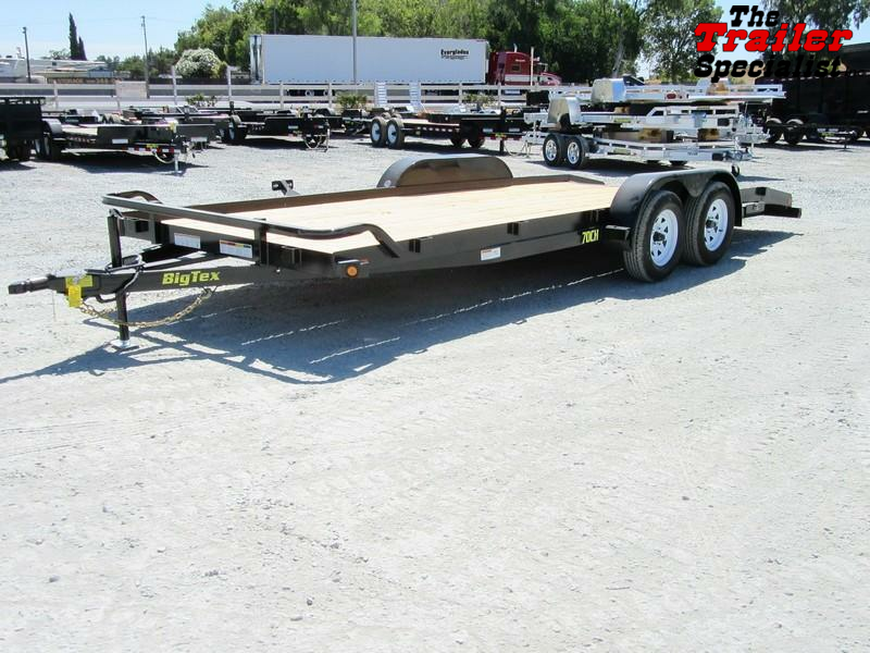 New Big Tex 70CH-20DTBRK2, 7 ft x 20 ft car hauler tandem axle open utility trailer. Standard features include a 7K 2" coupler, two 3500 lb. axles with electric brakes on BOTH axles for a 7000 lb. GVWR, a rear dovetail, a trailer weight of 2030# and a payload of 4970#, 4 ft slide-in ramps, tie down pockets sides and front, 15 in radial tires and wheels, front stop rail, 2K top wind jack, LED lights for maximum brightness and safety and a spare tire mount. Financing is available! Please call or email for more information.