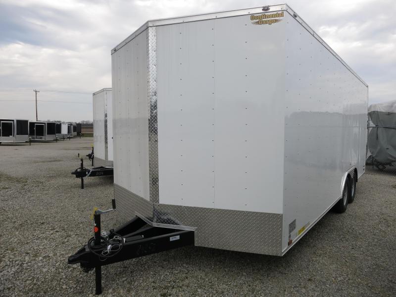 The Continental Cargo 8.5x20 Tandem axle enclosed trailer is WHITE in color with rear ramp door, Side door, (1) 12V Dome Light (Total of 2) with (1) Wall Switch, LED Tail Lights, roof vent, 6" extra height, flush lock side door, radial tires, 4 drings and 24" Aluminum Tread Plate Stoneguard (ATP). The GVW is 10,000 lbs.